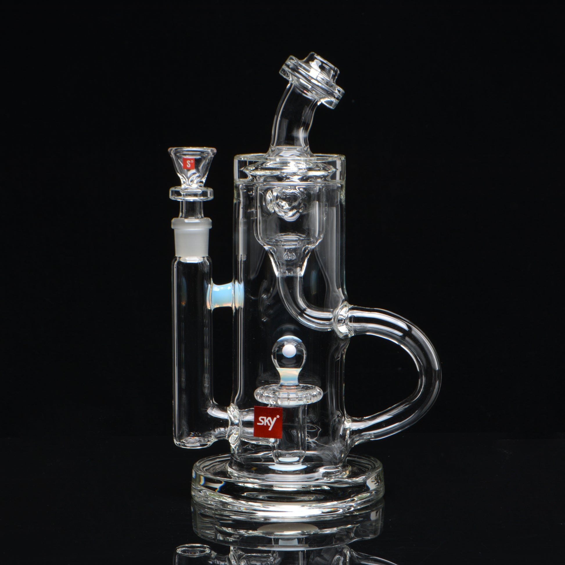 The 14mm Proton Showerhead Recycler is one of our most popular pieces! Inspired by the late 1800’s mathematician, Felix Klein. This piece is a great example of form and function coming together to create an elegant, yet sturdy piece of glass for your smoking pleasure.