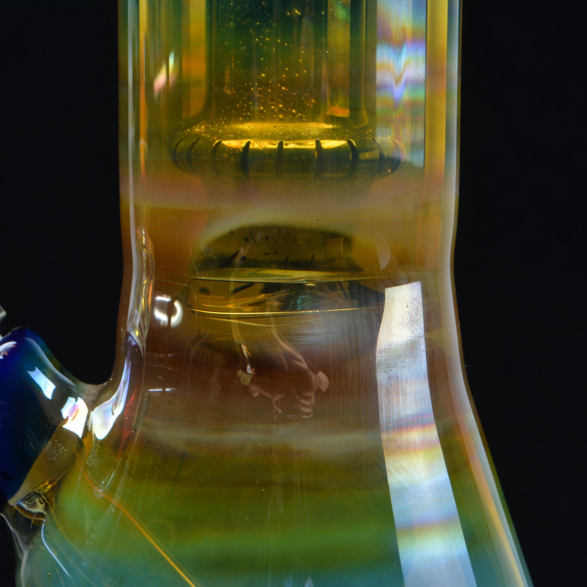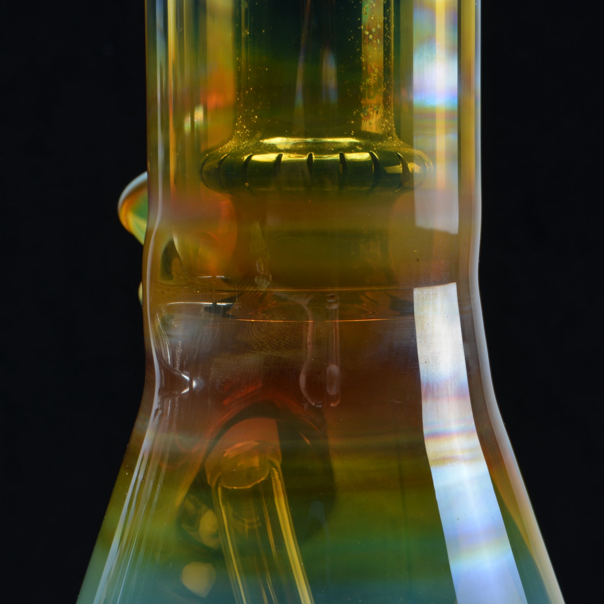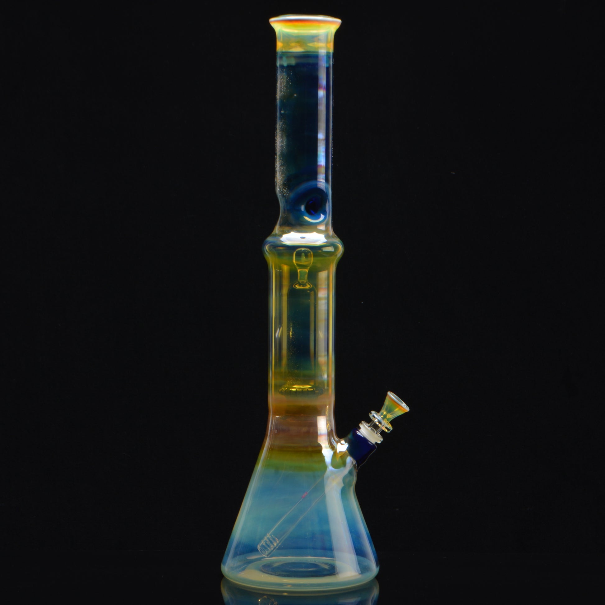 The Saturn 18in Fumed Showerhead Beaker bong is a true hybrid of old-school looks and modern functionality. You’ll find the same great showerhead perc that we use in all of our high functioning pieces nestled comfortably behind our multi-colored Galaxy Fuming.