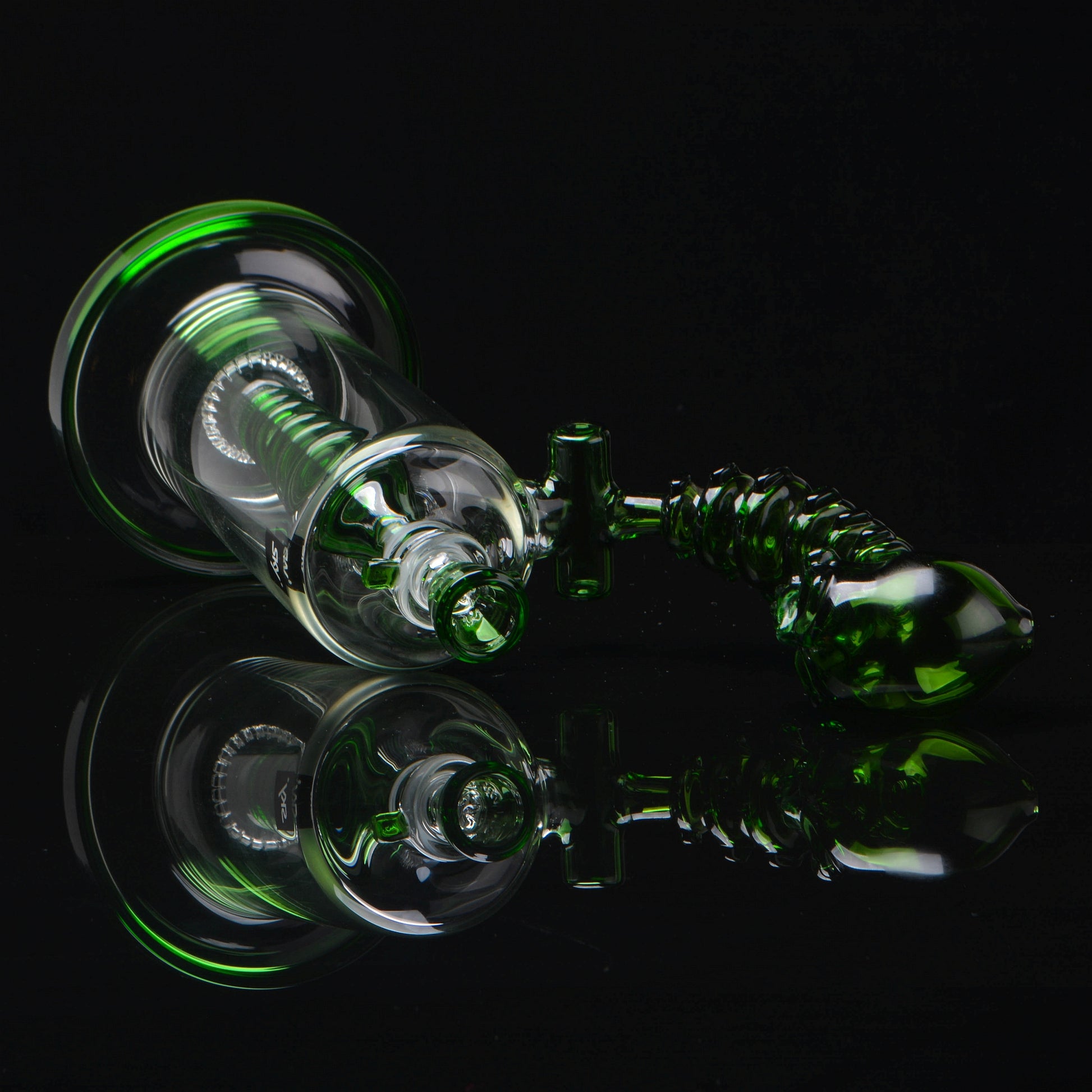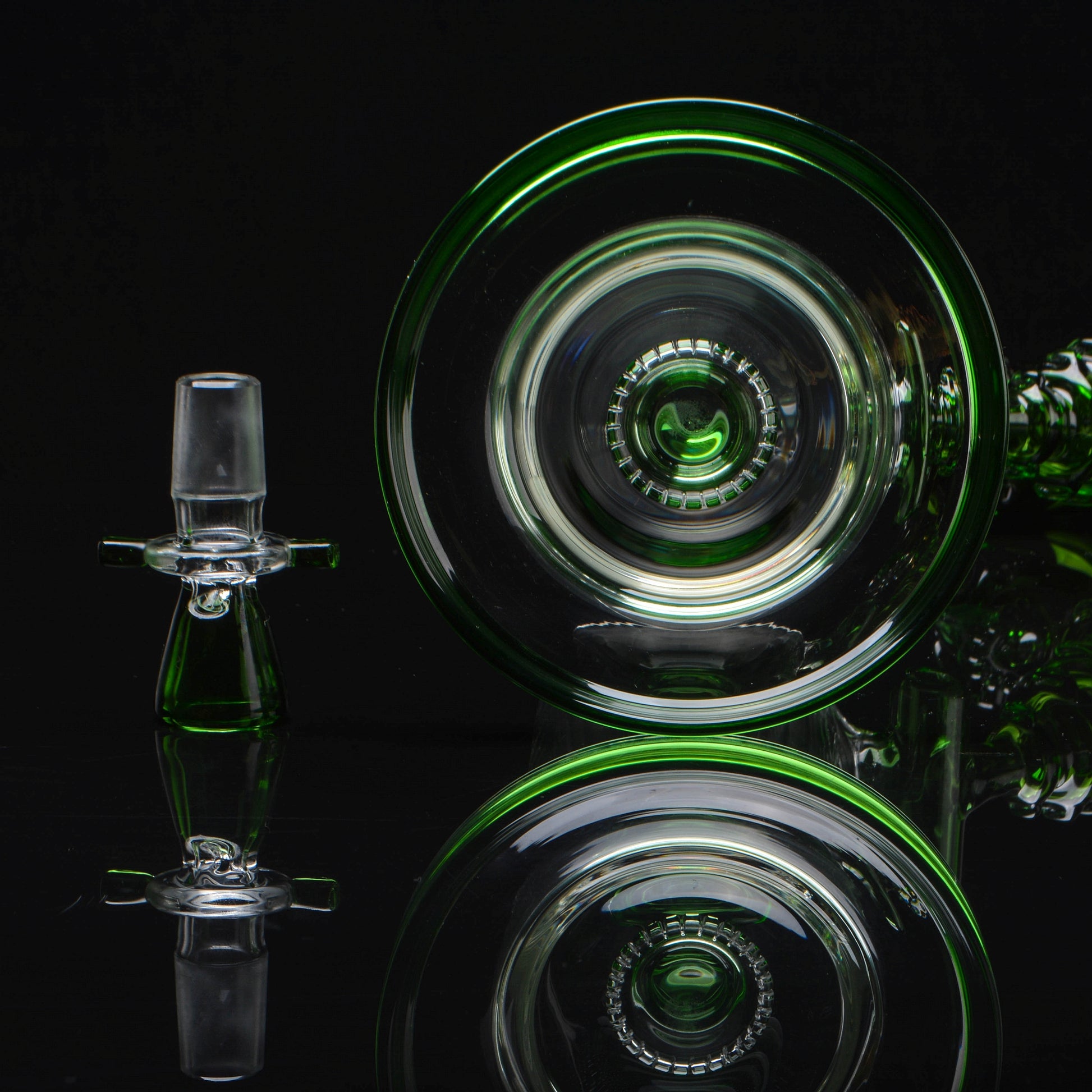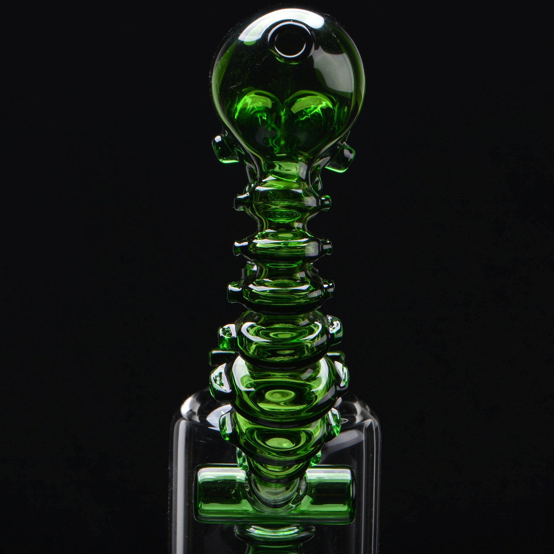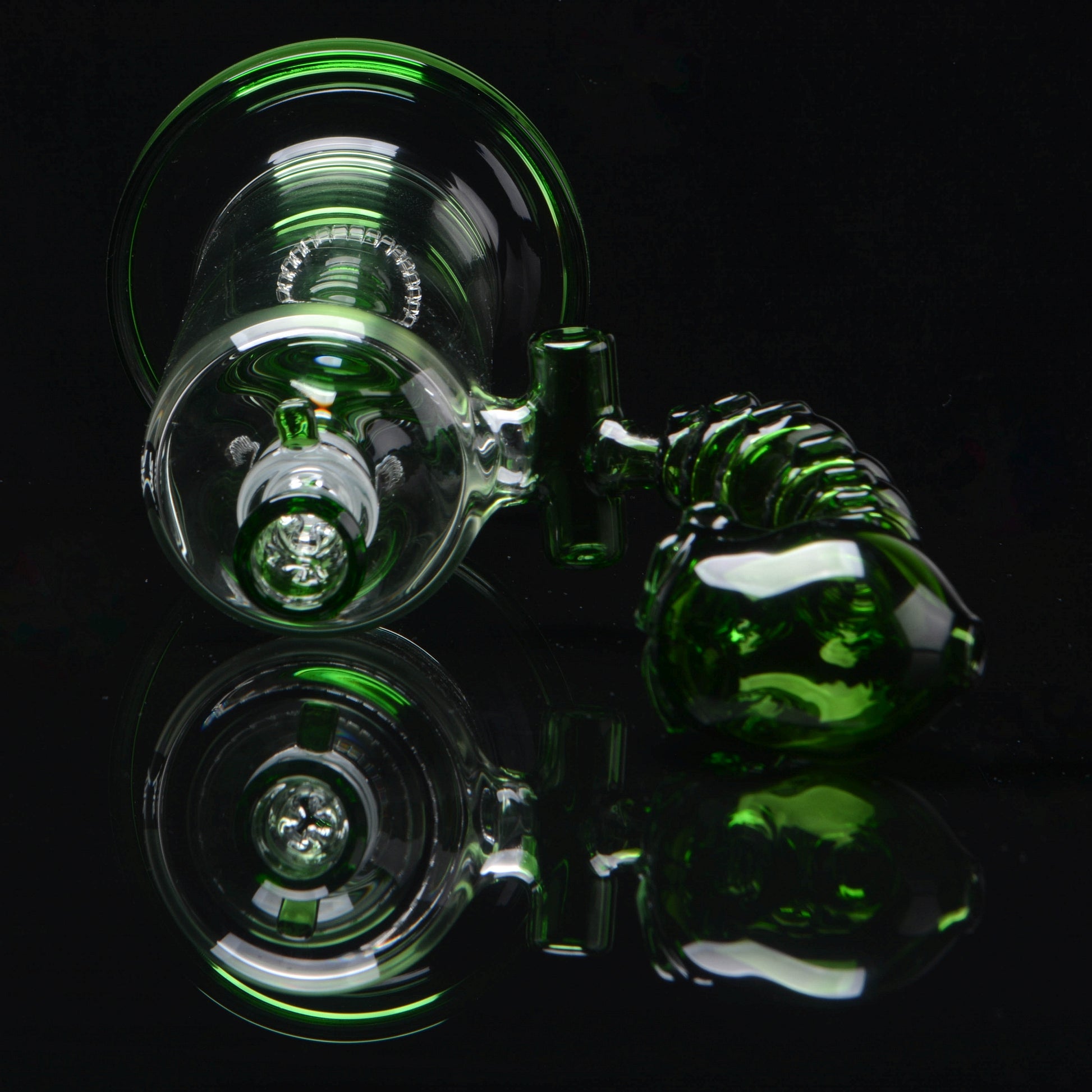 This version of the Lunar Bubbler is custom Collaboration between ourselves and our good buddy, Big Tom Glass! We used classic transparent green for this piece! Tom did the epic sculpting on this collab! The piece comes with a matching Ice pinch style bowl as well!