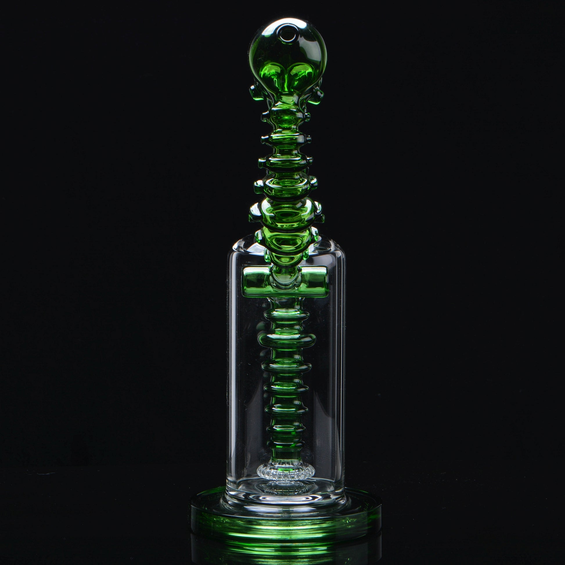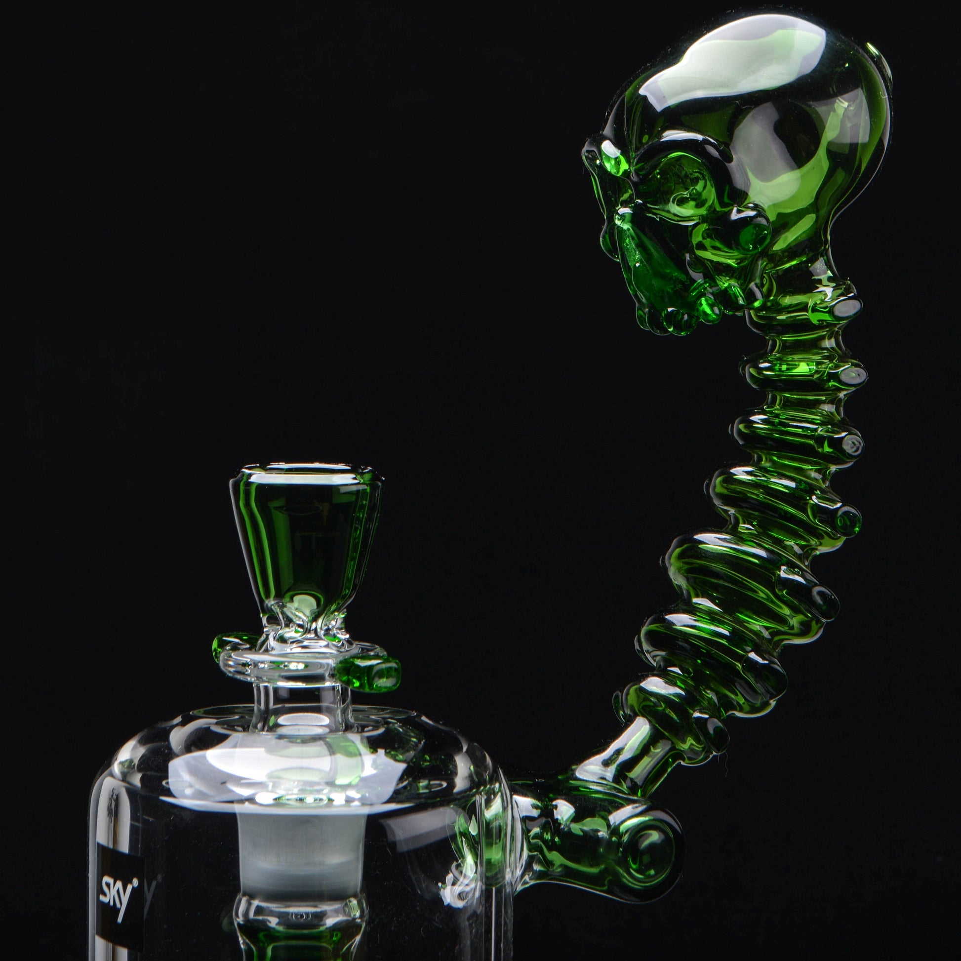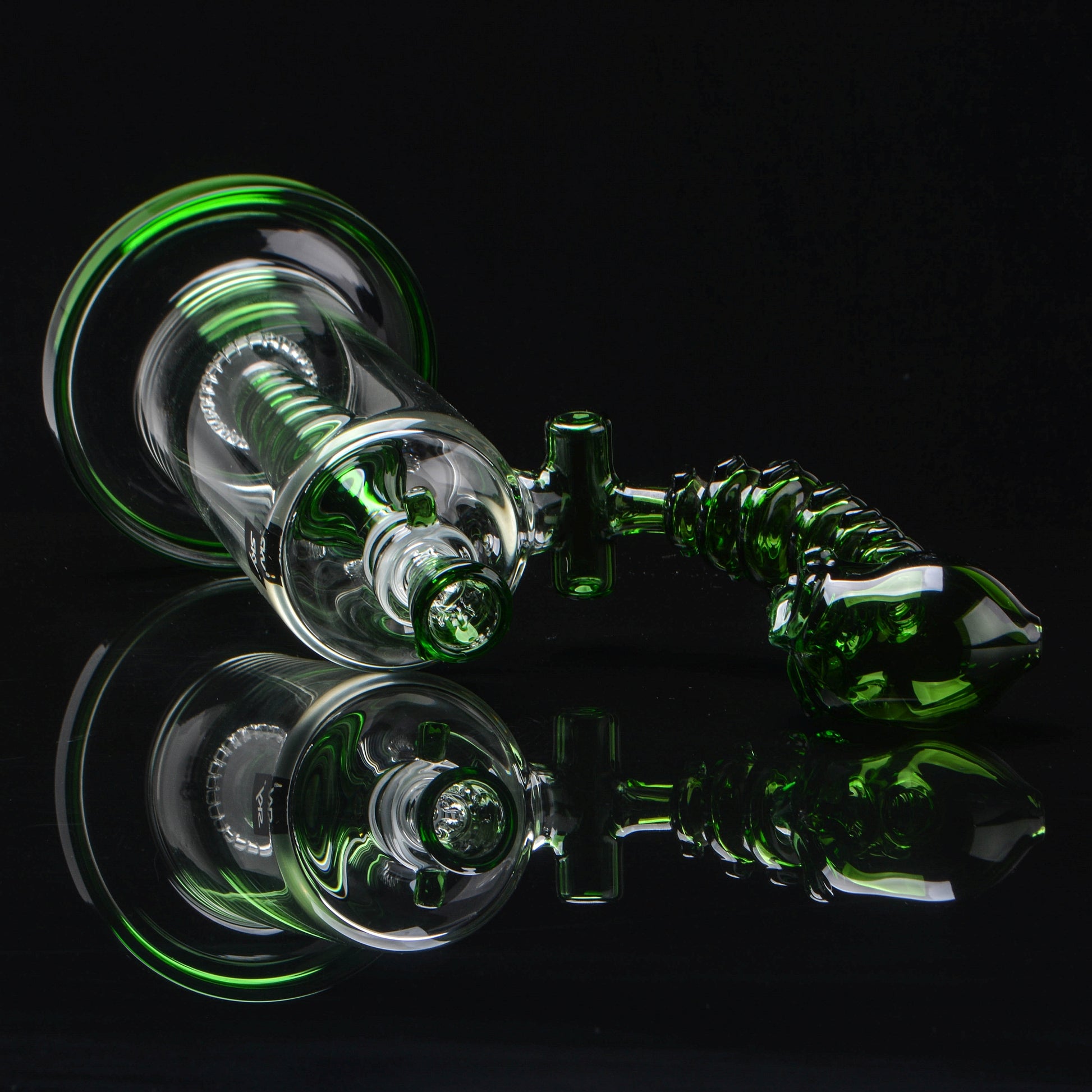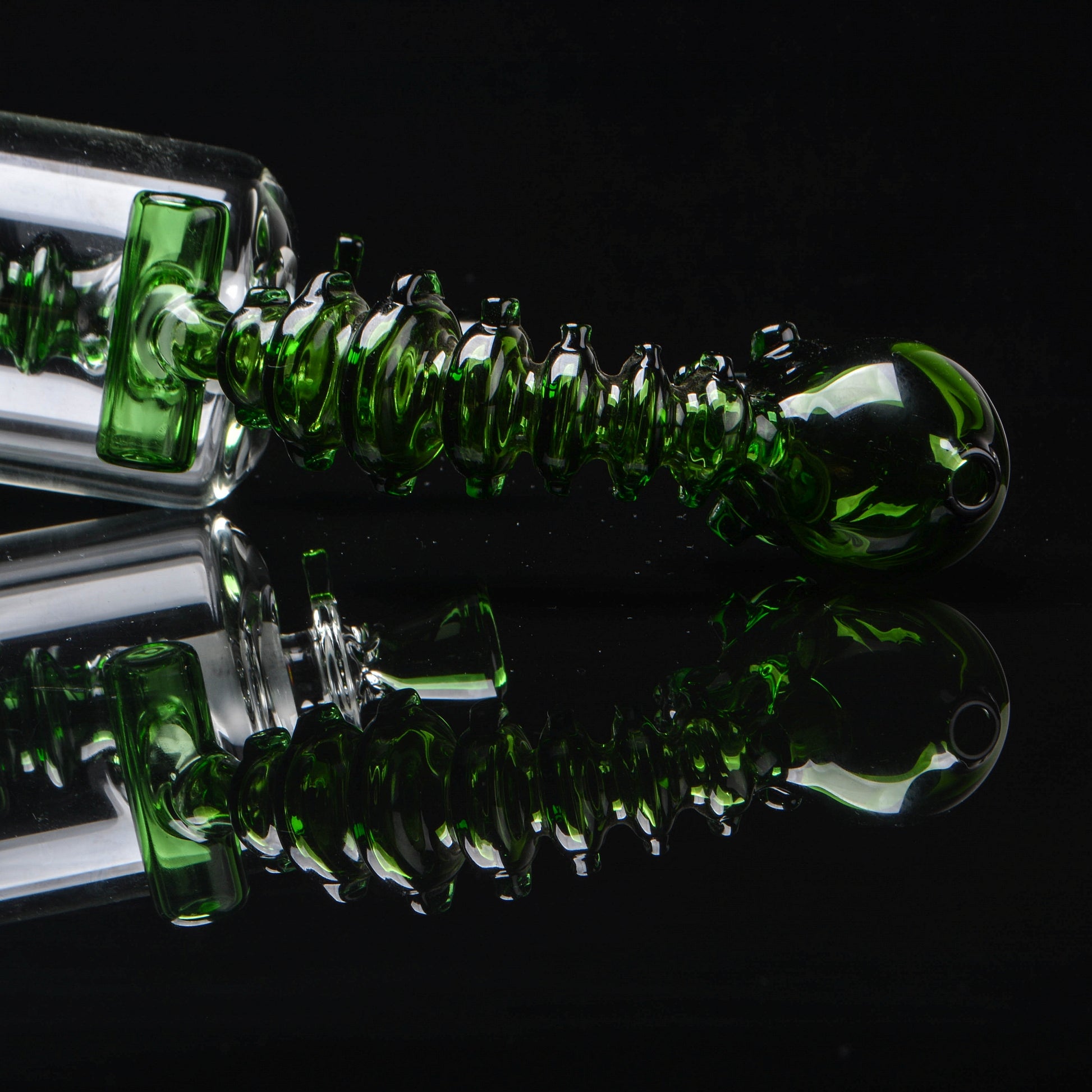 This version of the Lunar Bubbler is custom Collaboration between ourselves and our good buddy, Big Tom Glass! We used classic transparent green for this piece! Tom did the epic sculpting on this collab! The piece comes with a matching Ice pinch style bowl as well!