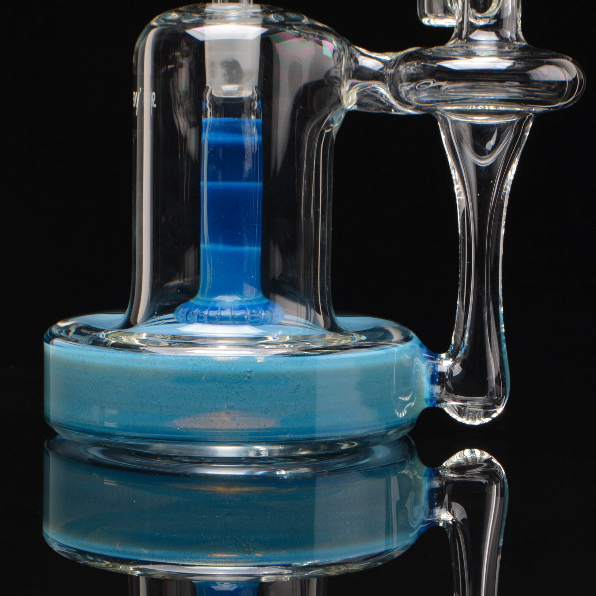 The Neutron Recycler is one of our favorite pieces to make! The particular recycler was made with left over tubing we had from another custom project!! Because of this, were letting her go for an awesome deal! This piece is accent mix of ghost and blue stardust, made by at North Star Glass! The color absolutely pops in the sunlight! There is a 4mm opal set into the neck of this piece!