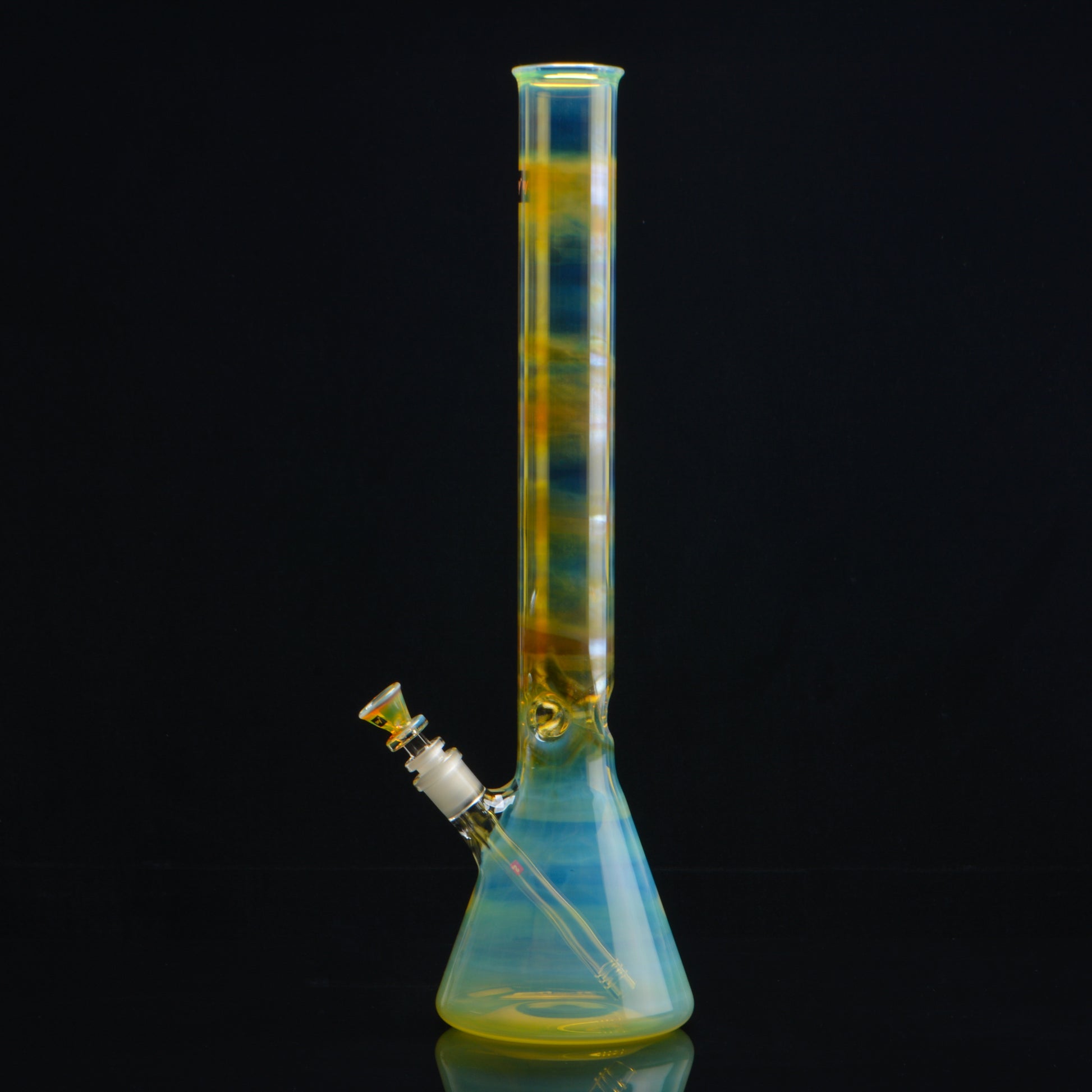 The Mercury 18in beaker bong is a classic beaker with a homage to our Roots Series. We offer the same silver-fuming back in the 90’s with a modern shaping and updated equipment. This beaker is fully fumed with silver. We literally burn the metal into the surface of the glass! The cause the piece to change color the more you use it. The colors range from yellow, blue and green! There’s no trade-off for art over function in this piece.
