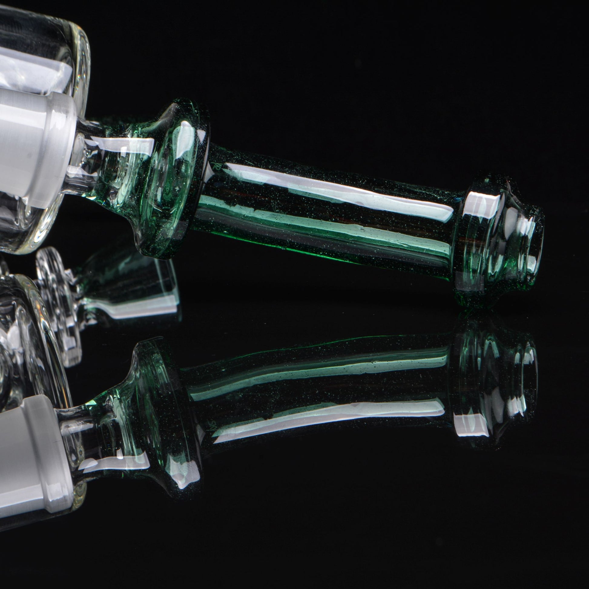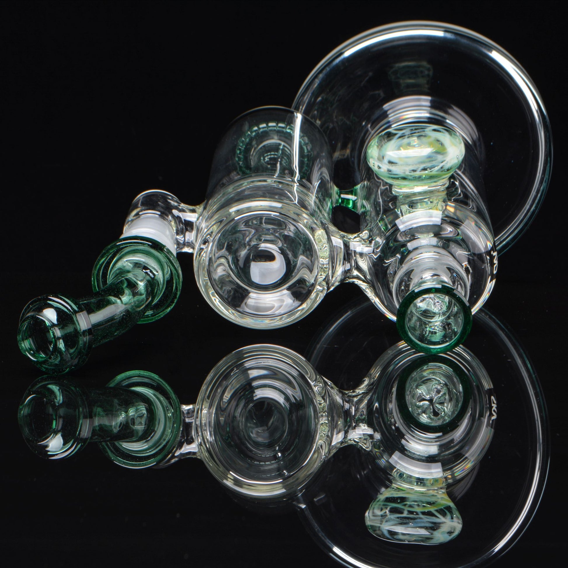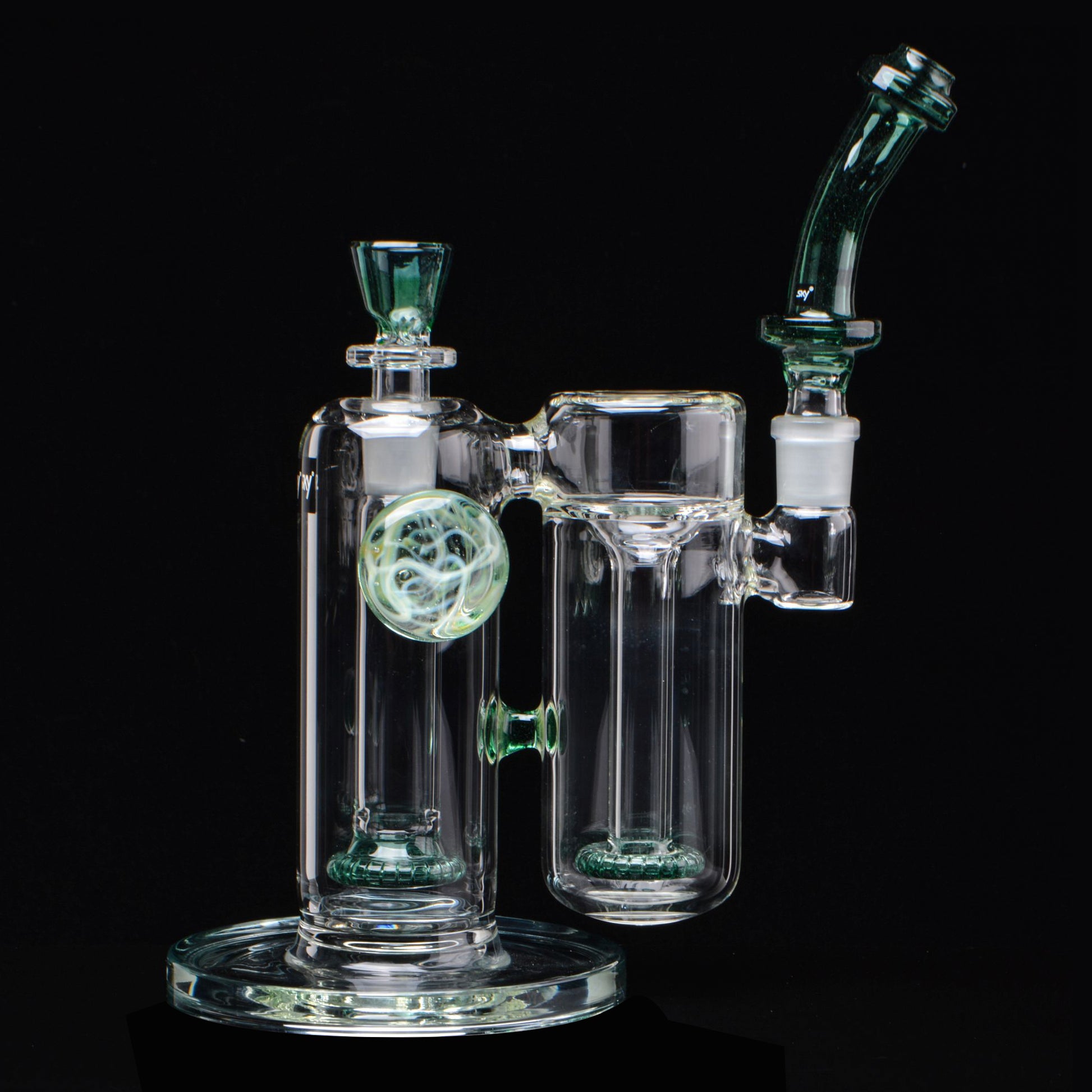 The Double bubbler is one of our latest edition to our production line! The Double Bubble has been around for over 30 years, we decided it was time to add our unique touch to it! This piece features 2 of out signature showerhead perks too provide the maximum percolation. We took an opportunity to go wild on a build to celebrate the piece! The bubbler is heavily accented in North Stars glass Nemo! Nemo is an awesome transparent tonic green! The piece functions amazing! Make sure to check out the function video bellow!