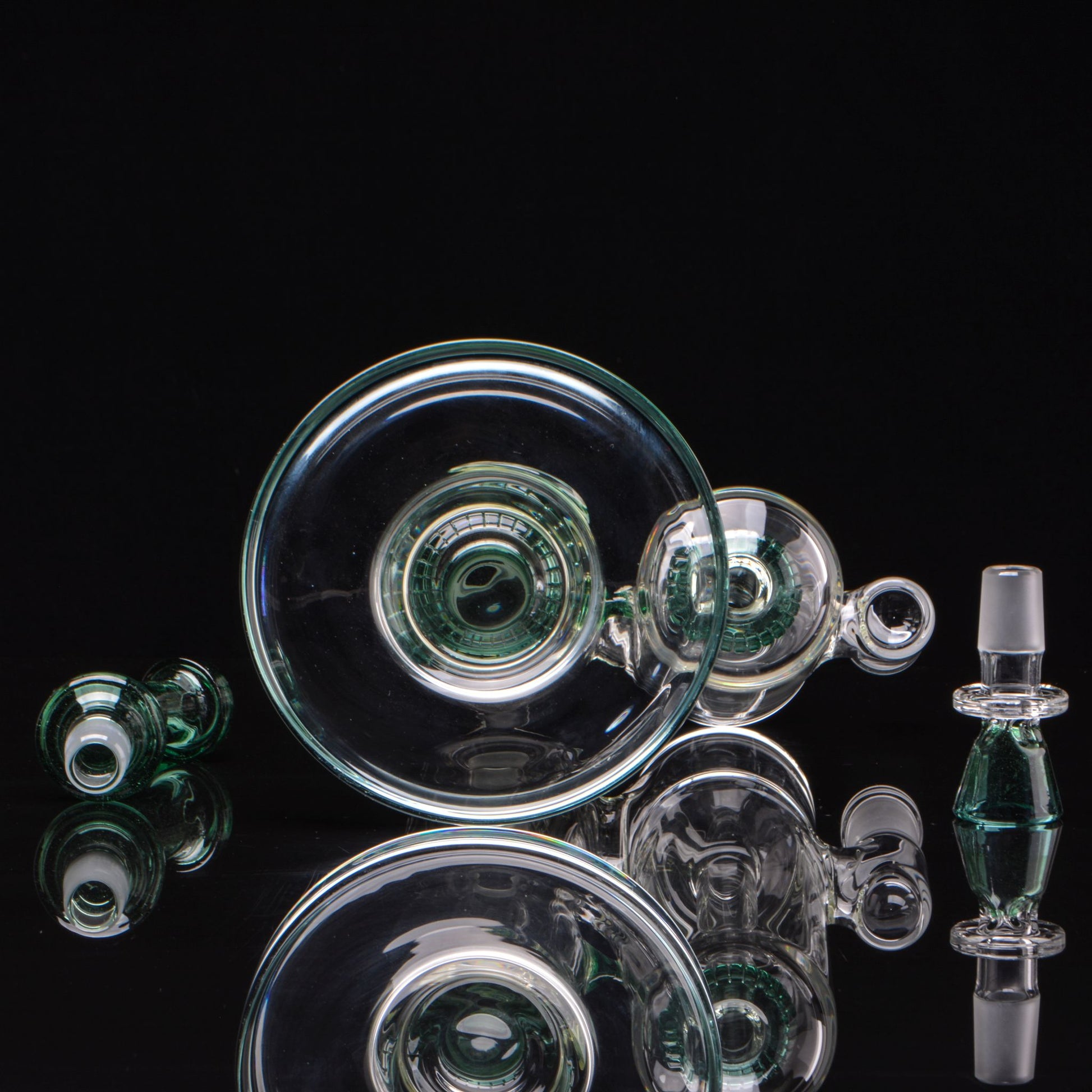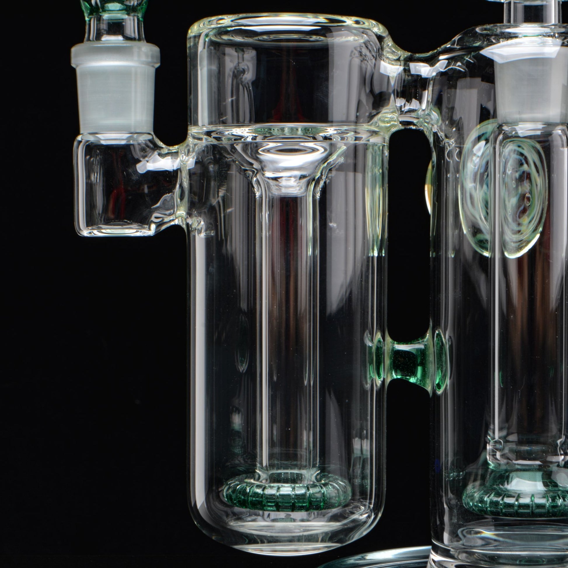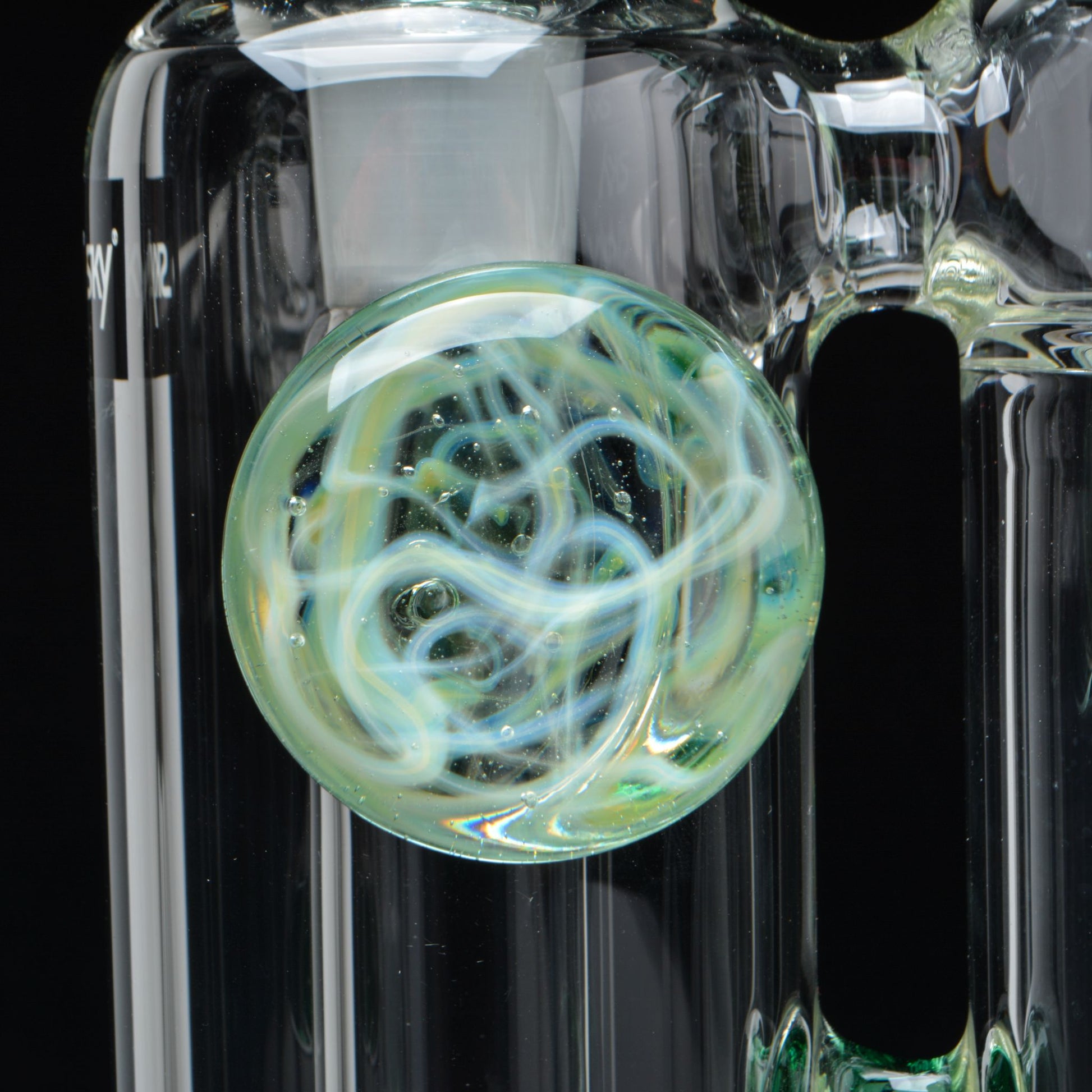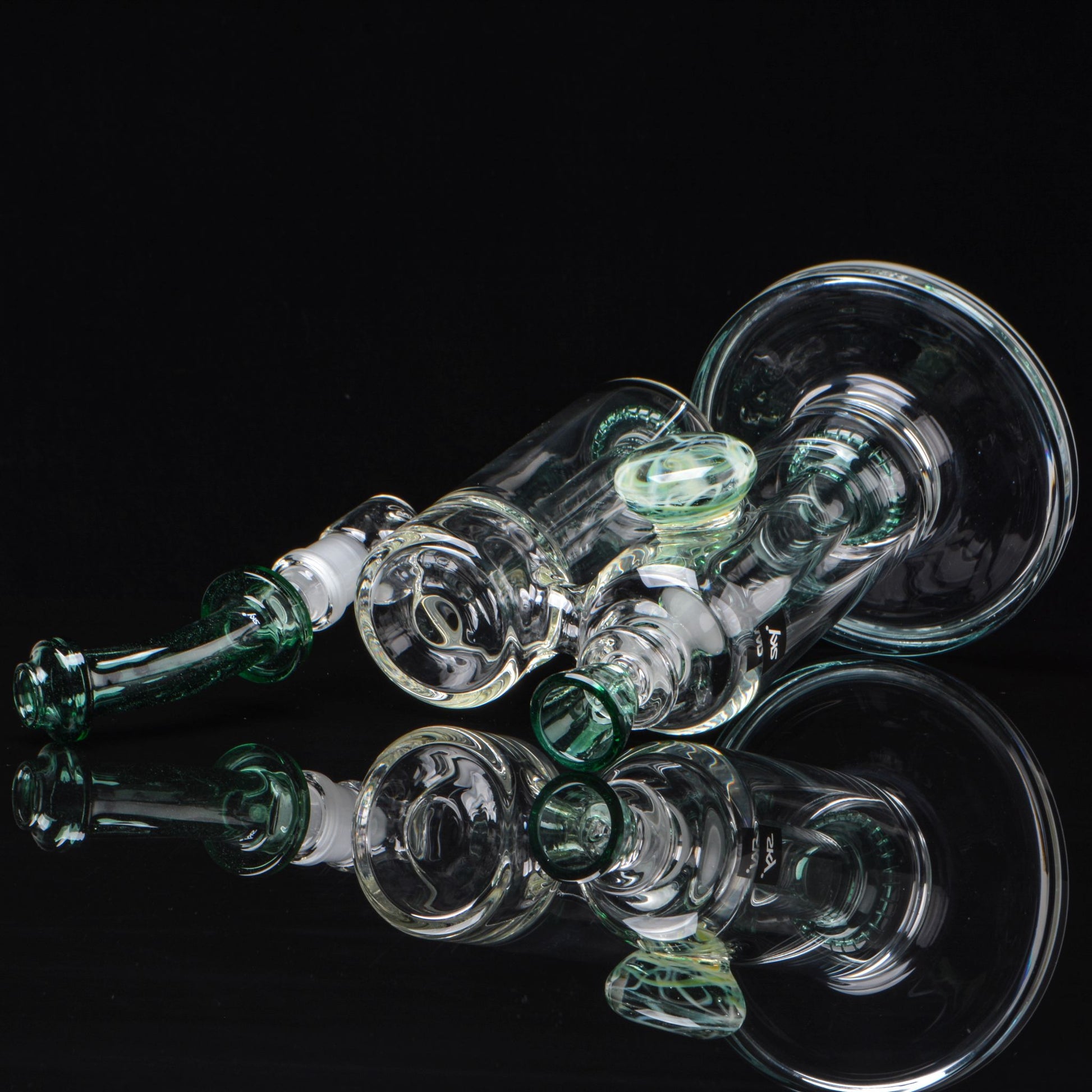 The Double bubbler is one of our latest edition to our production line! The Double Bubble has been around for over 30 years, we decided it was time to add our unique touch to it! This piece features 2 of out signature showerhead perks too provide the maximum percolation. We took an opportunity to go wild on a build to celebrate the piece! The bubbler is heavily accented in North Stars glass Nemo! Nemo is an awesome transparent tonic green! The piece functions amazing! Make sure to check out the function video bellow!