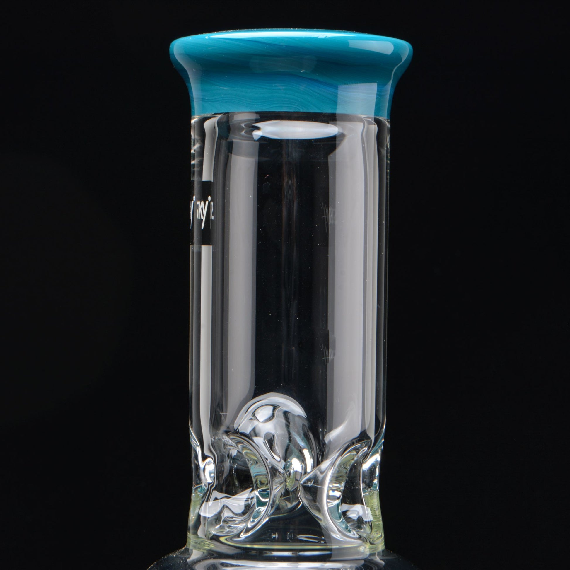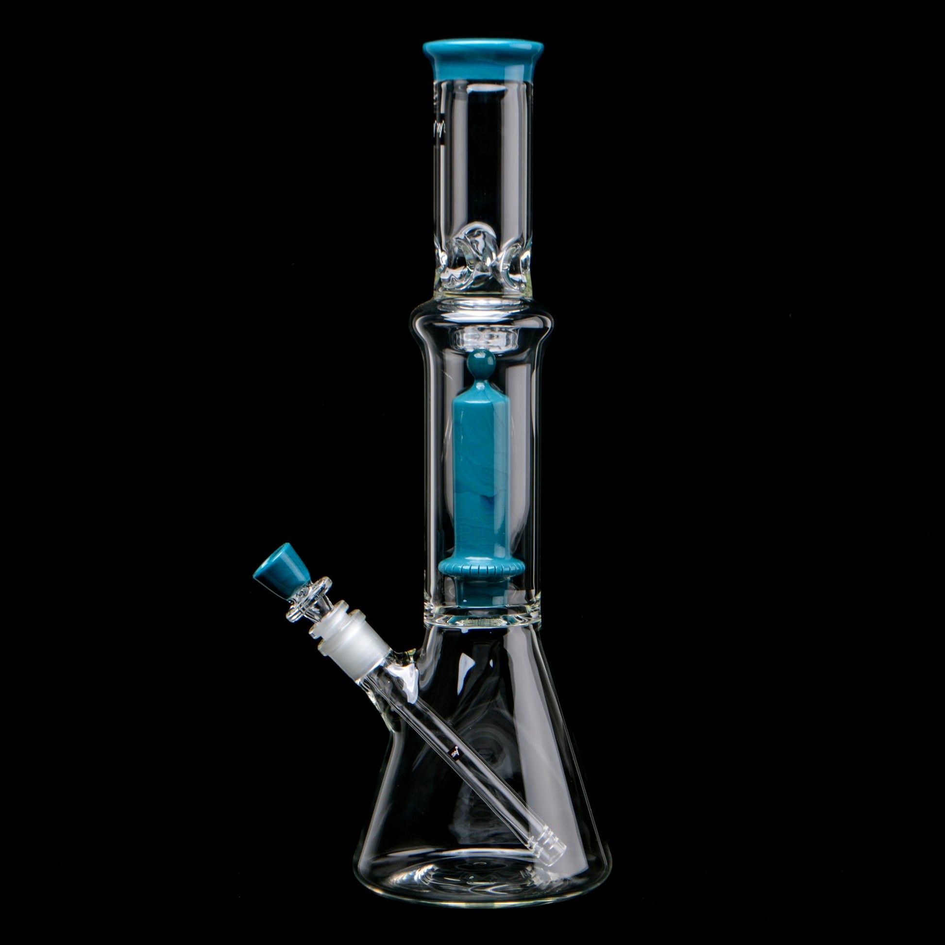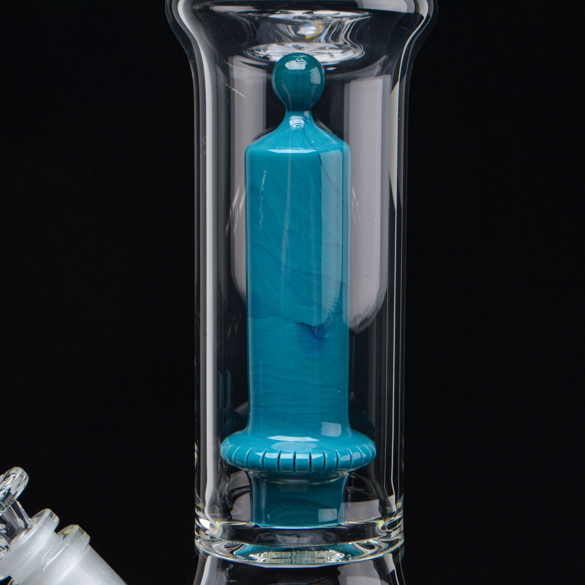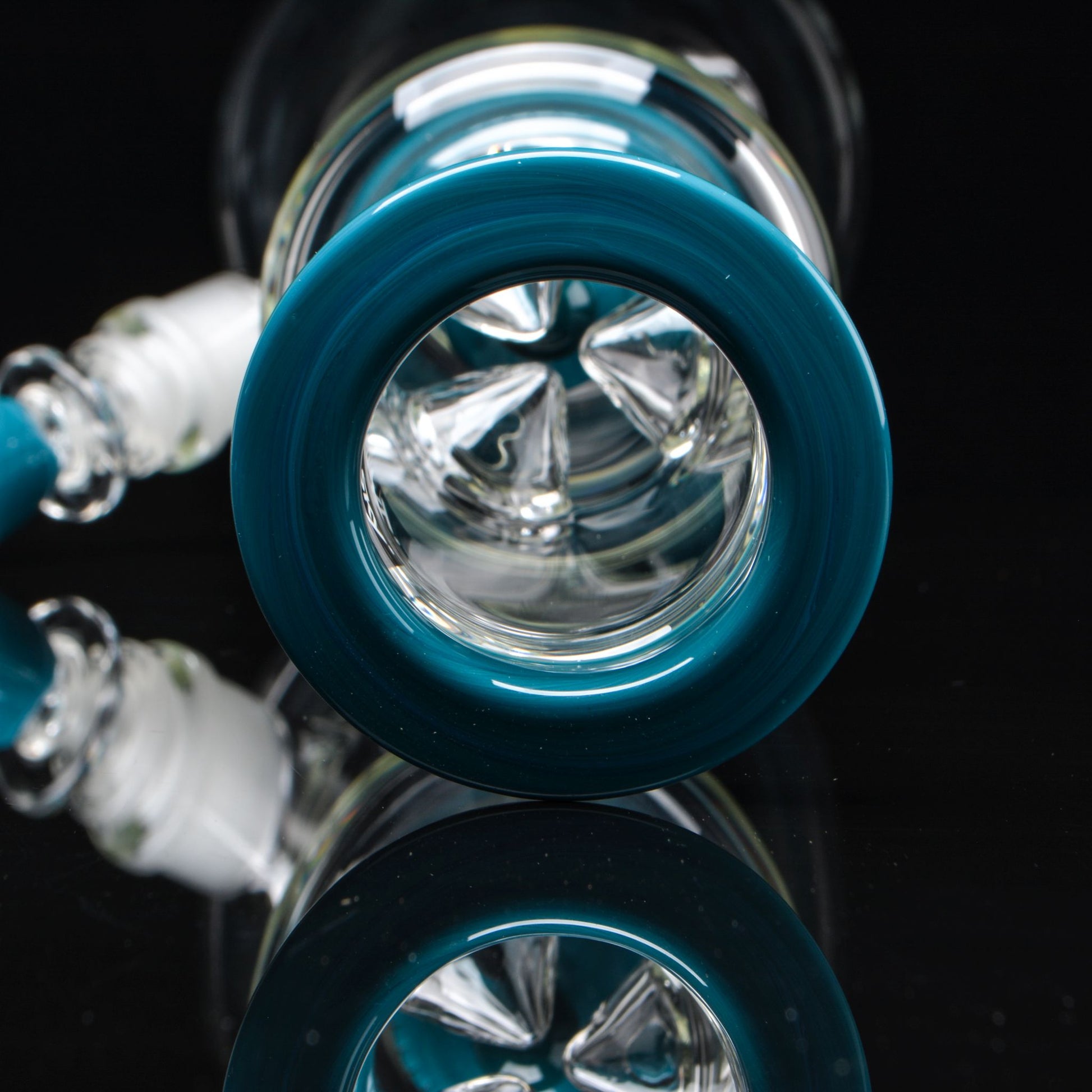 The Peacock Beker is an artistic take on our classic Zenith Beaker. This piece features the the same perks and function of our zenith beaker! We heavily accented the piece in Glass Alchemy's Peacock color! The color is so vibrant it make you want to try to eat the glass (Please don't so this for real!!!!) ! This was a fun artistic project , that turned into a 1 of a kind piece! This Piece represents the cross roads of form and function! It comes with a matching 14mm Pinch Style Bowl Piece as well!!